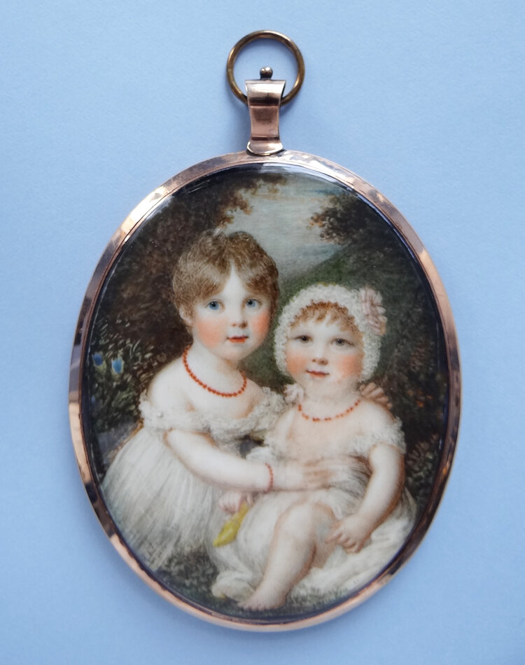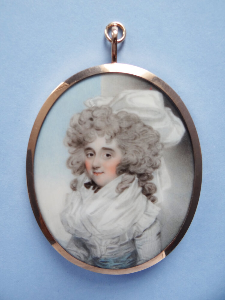 Portrait miniatures are often found in eighteenth-century society paintings, but you wouldn’t know they’re there. What might be seen is a chain, on which a miniature was worn like a pocket watch. The portrait would be tucked under clothing, on the left, close to the heart; it faced inwards, so that nobody else could see it.