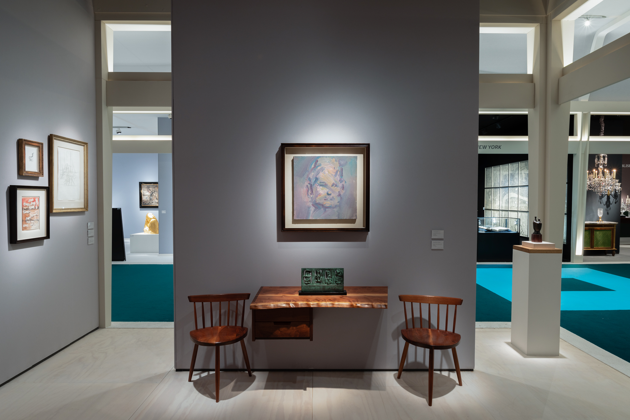 George Nakashima Floating Shelf and Frank Auerbach portrait of David Landau at Piano Nobile's stand at The Treasure House Fair 2023