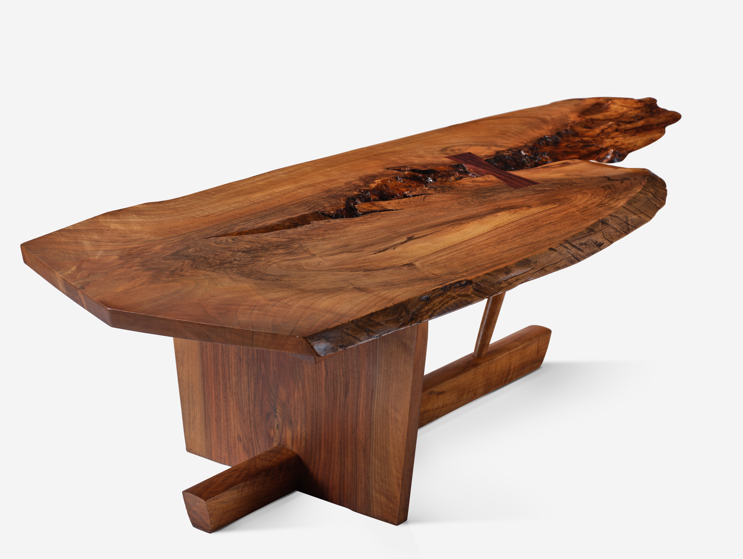 Today, the market of the Japanese American woodworker, architect and furniture maker, is flourishing. George Nakashima, born in the US in 1905, is widely acknowledged to be the founder of the American Studio Craft Furniture movement, which had its birth in the rural artists' colony of New Hope, Pennsylvania, in the 1940s. After travelling the world as a young man, including stints working as an architect and designer in Japan and India, it was in an internment camp in Idaho that Nakashima met the Japanese master carpenter Gentaro Hikogawa and began to apply himself to making one-off pieces of hand-crafted furniture, using traditional Japanese joinery techniques. In 1943, the American architect Antonin Raymond successfully sponsored Nakashima’s release from the camp and invited him to his farm in New Hope, Pennsylvania. There, in his studio and workshop, Nakashima began to explore the organic expressiveness of wood, and embarked on his hunt for timbers with ever more dynamic knots and burls and figured grains. While he constructed many different kinds of distinctive furniture, he is best known for his large tables made from giant slices of tree, sometimes entire, sometimes linked by butterfly joints, with the natural edge of the trunk creating the contoured edge of the table.