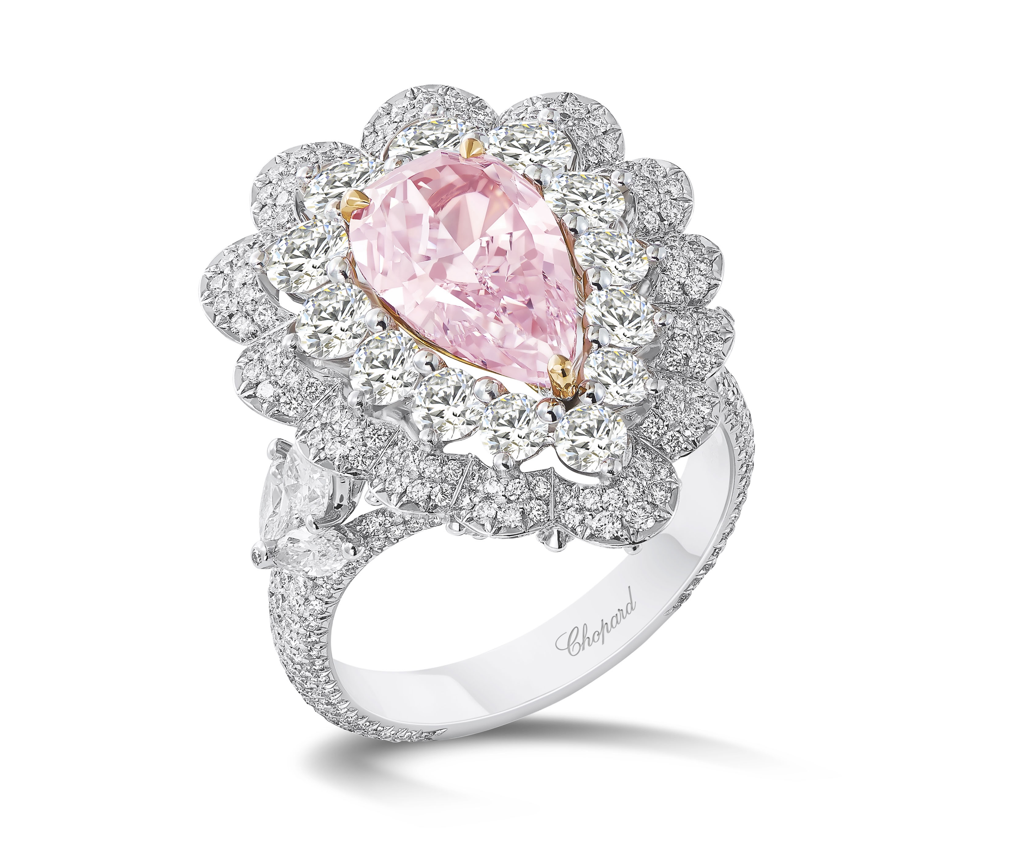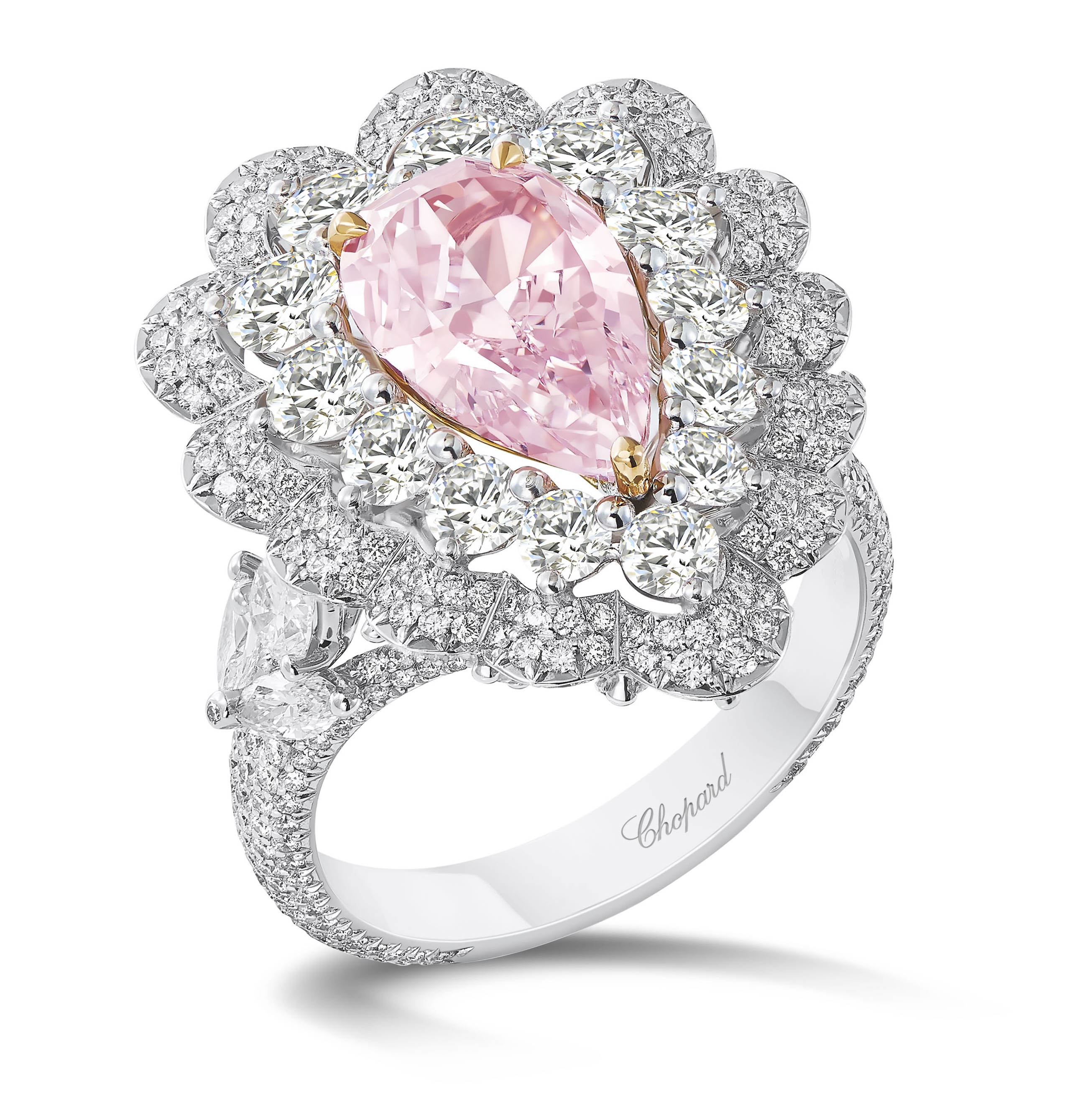 Haute Joaillerie collection ring by Chopard in 18k white and rose gold set with a pear-shaped, 2.4 carat fancy pink diamond and white diamonds, price on request.