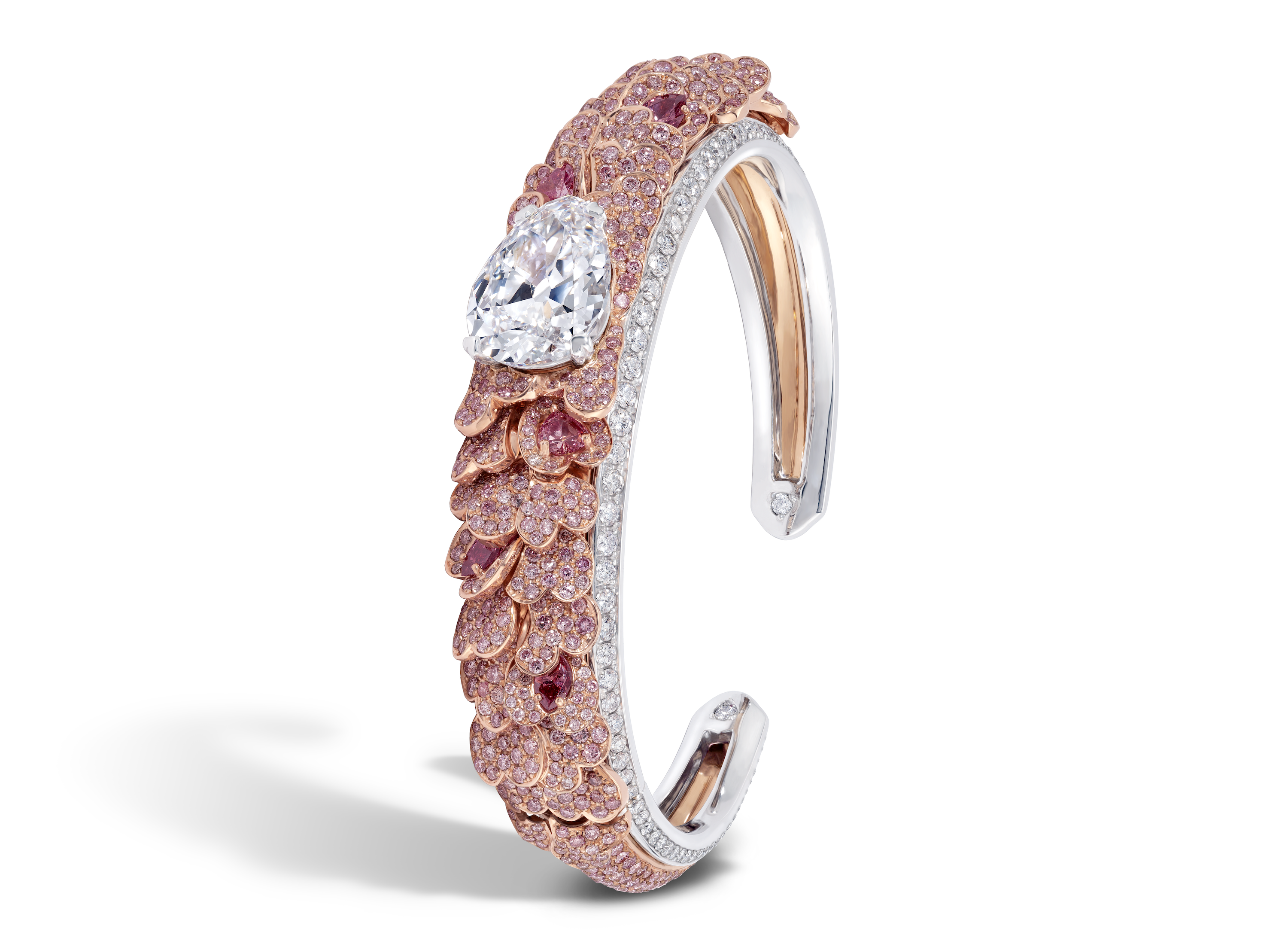 High jewellery bangle by David Morris in 18k white and rose gold, set with 9.97-carats of pink diamonds and a 6-carat D internally flawless pear shape white diamond, price on request.