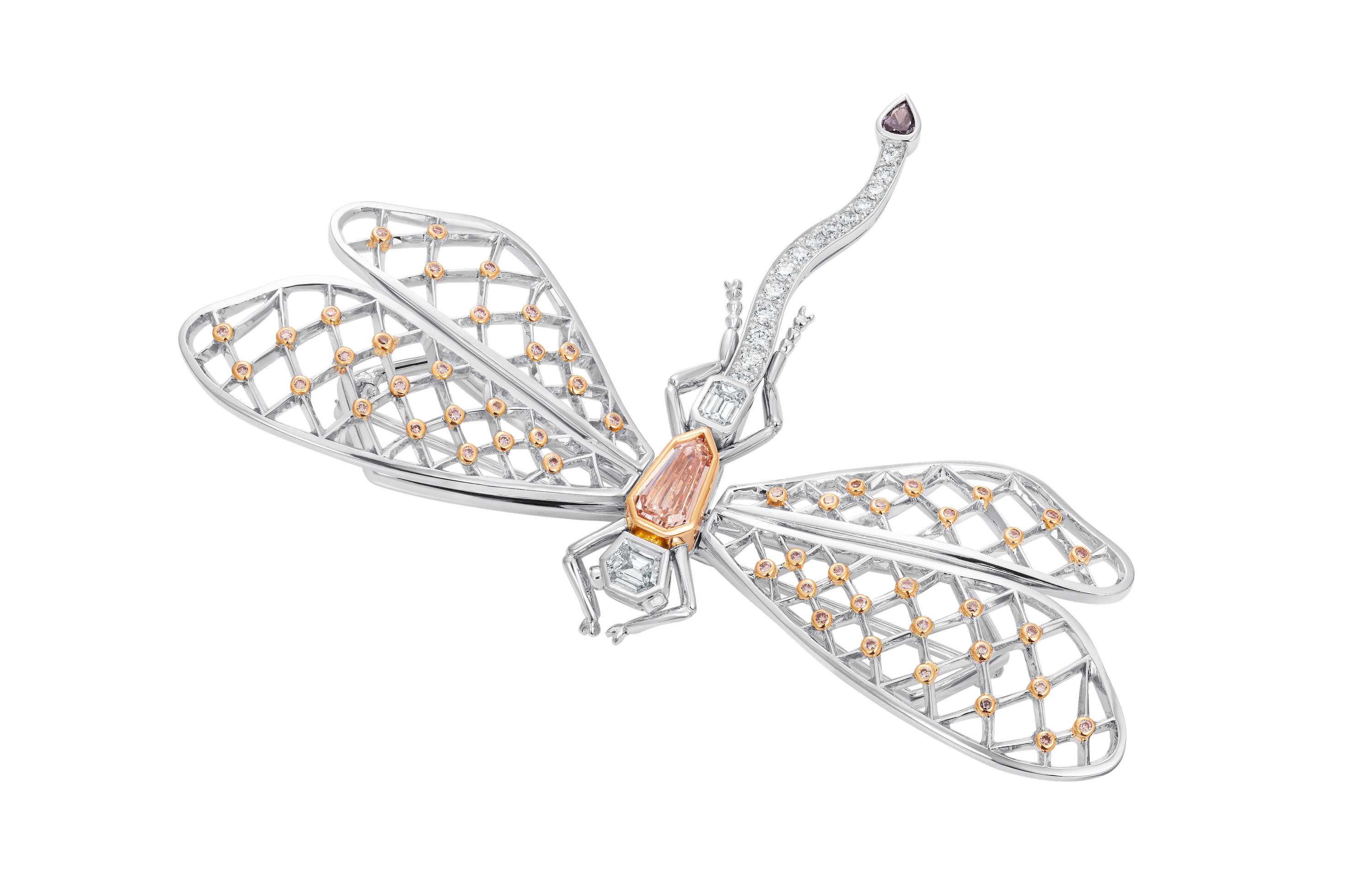One-of-a-kind Dragonfly brooch by Hirsh London with pink diamonds set in platinum and 18k rose gold, price on request.