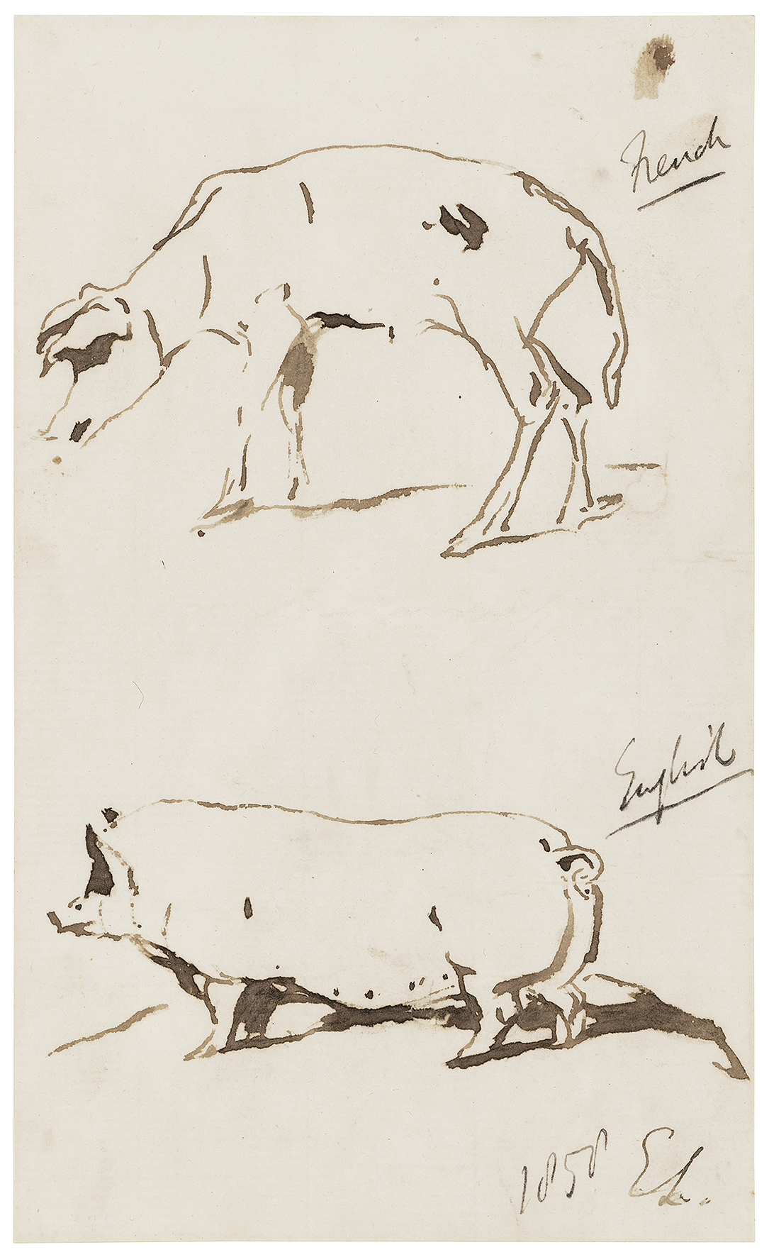 Sir Edwin Landseer, R.A., R.I. 'The rounded English pig and the scrawny French pig pen and brown ink'