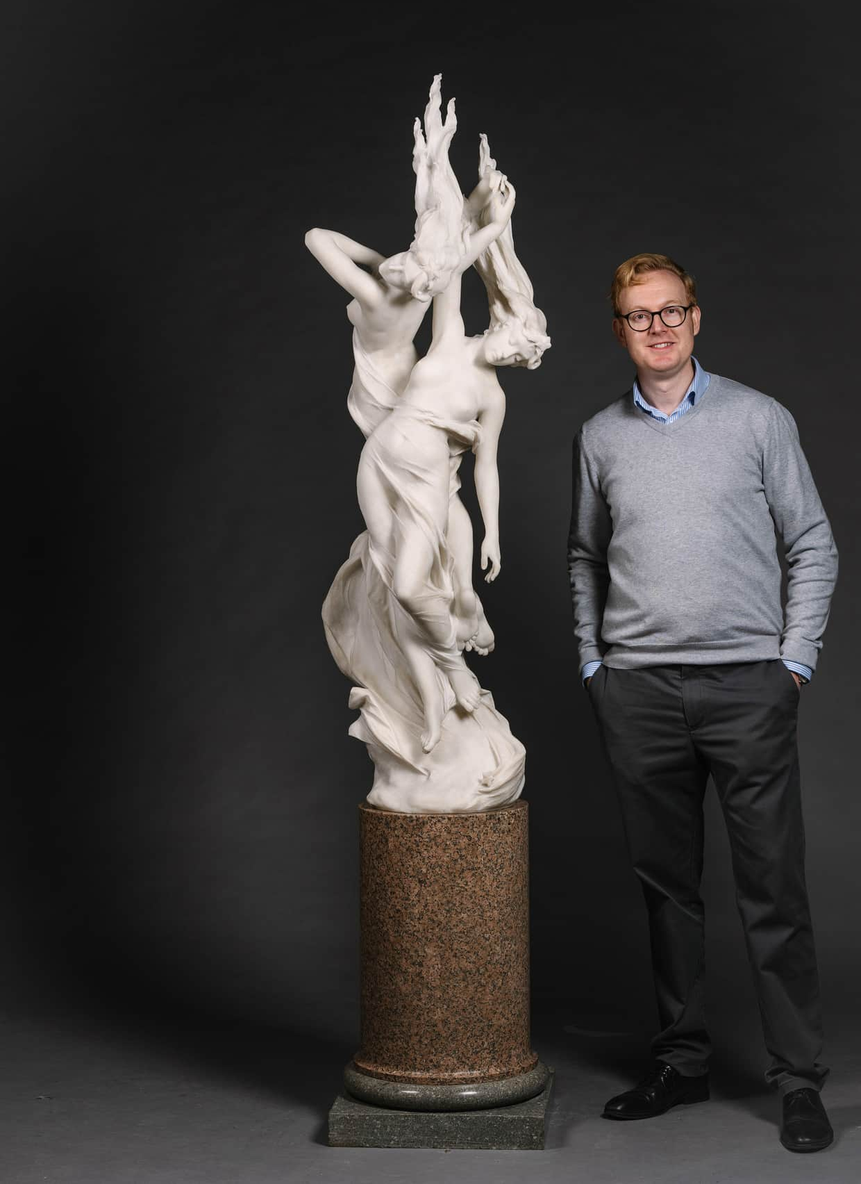 Giles Forster, Director at Adrian Alan Ltd, posing with ‘Falling Stars’ by Vittorio Caradossi (1861-1918)