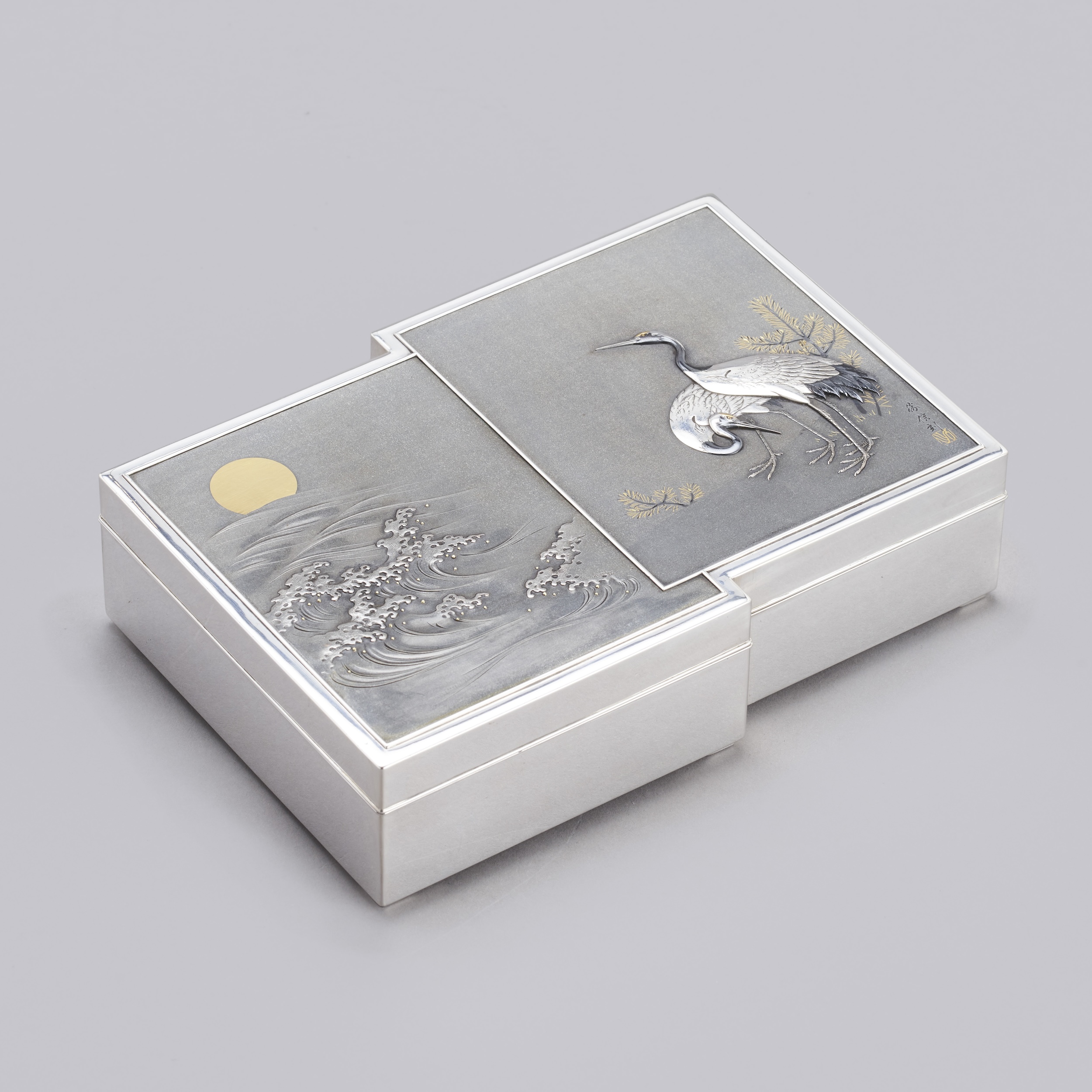 A Silver And Shibuichi Box With Two Cranes And Crashing Waves Beneath A Rising Sun, Meiji Period 1868-1912.