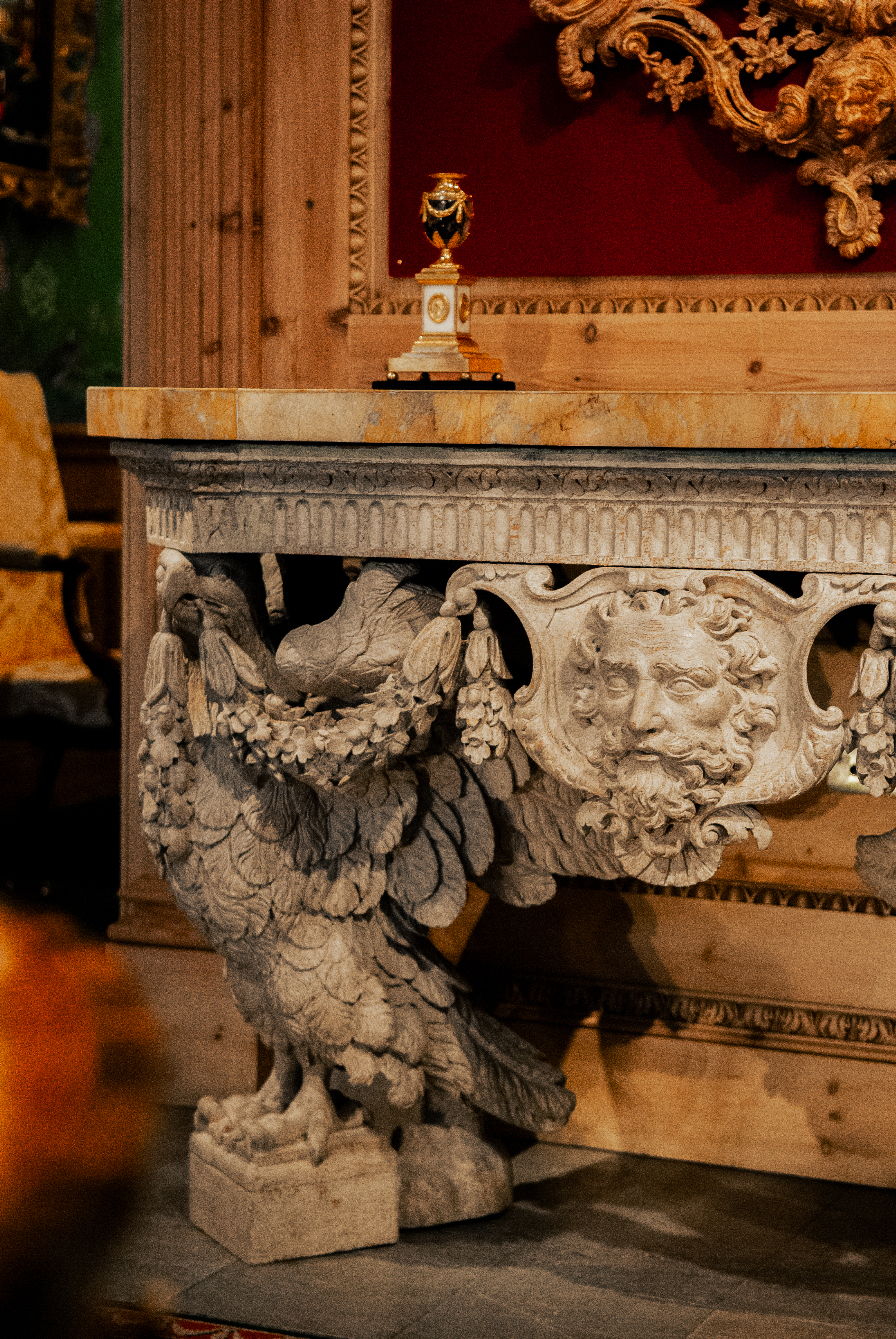 He is currently offering a Carlton House writing desk once owned by Mark Birley, founder of Mark’s Club and Annabel’s, and another previously belonging to actor Sir John Mills. Other works are identified by the stately home from whence they originated. A George III giltwood mirror from the White Drawing Room at Harewood House by Thomas Chippendale, is a prime example. Adorned with garlands of gilded wooden flowers cascading down either side of a round looking glass, it rests on two golden sphinx candleholders and is crowned by a cameo of a woman framed by fluttering ribbons.