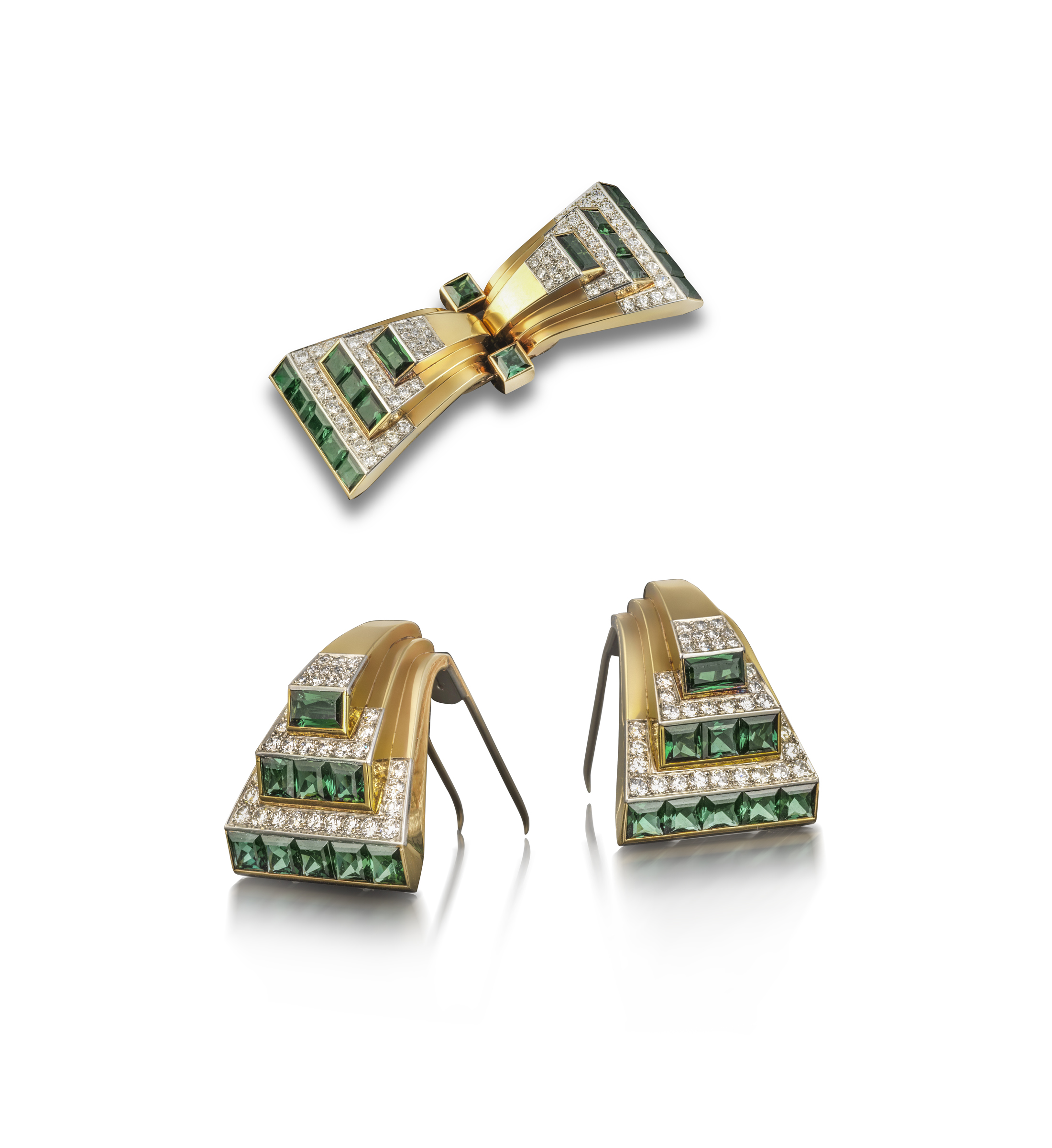 “The Green Tourmaline & Diamond Brooch by Cartier, which has both an amazing design and a special story. It’s called “escalator” style and the term refers to the brooch’s stepped design, which mimics the upwards movement of escalators, invented at the beginning of the 20th century. Its geometric style reflects the rational aesthetic of Art Deco, and it is enhanced by the contrast between green tourmalines and diamonds. It is a set with square baguette cut green tourmalines and diamonds and can be separated to be worn as a pair of dress clips. Made circa 1940 in America from 18ct yellow gold.”