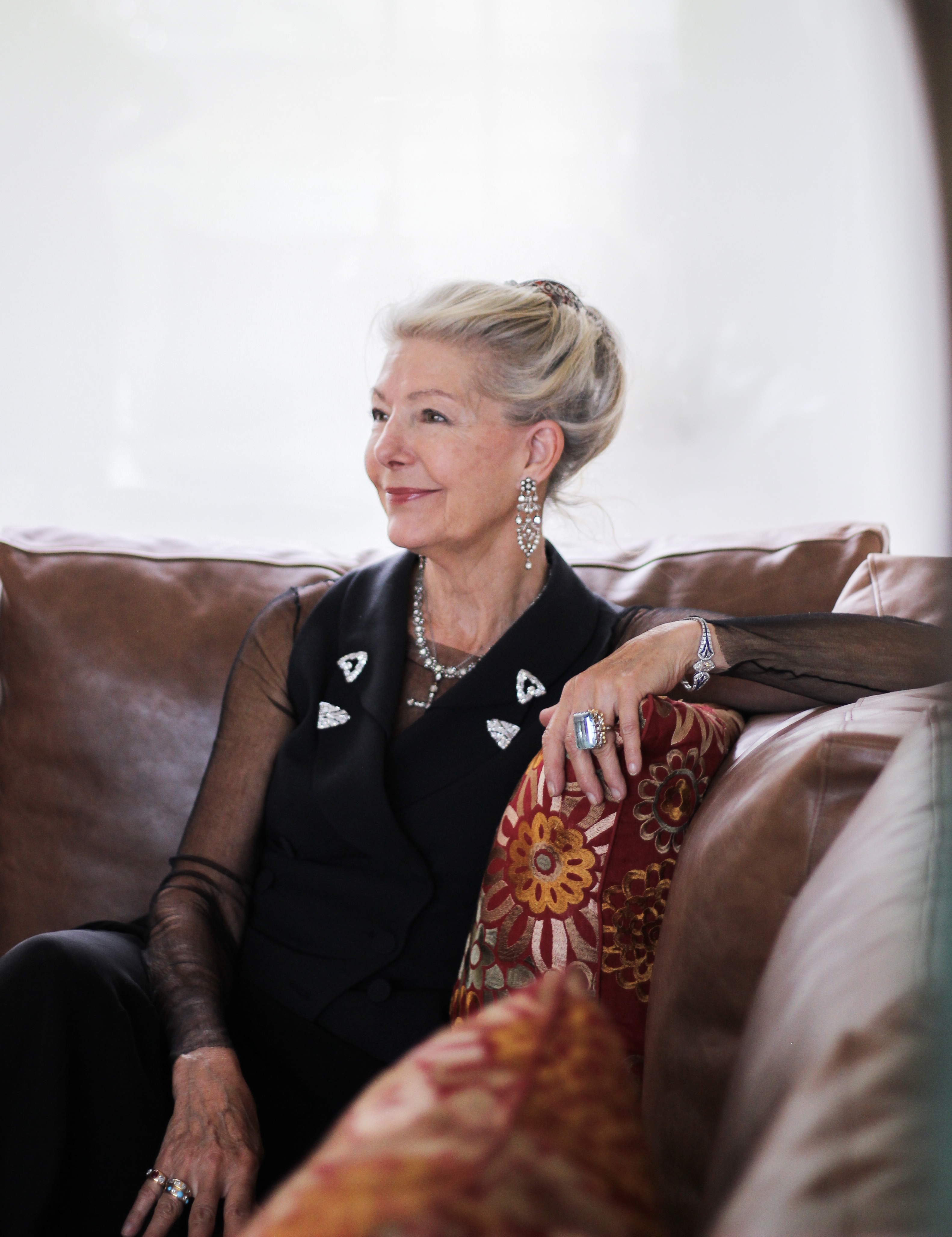Sandra was wearing a pair of Art Deco Diamond Double Clips. The clips are set with round diamonds and baguette cut diamonds. Can be worn as a brooch or separately as clips. Mounted in platinum. American, circa 1930.