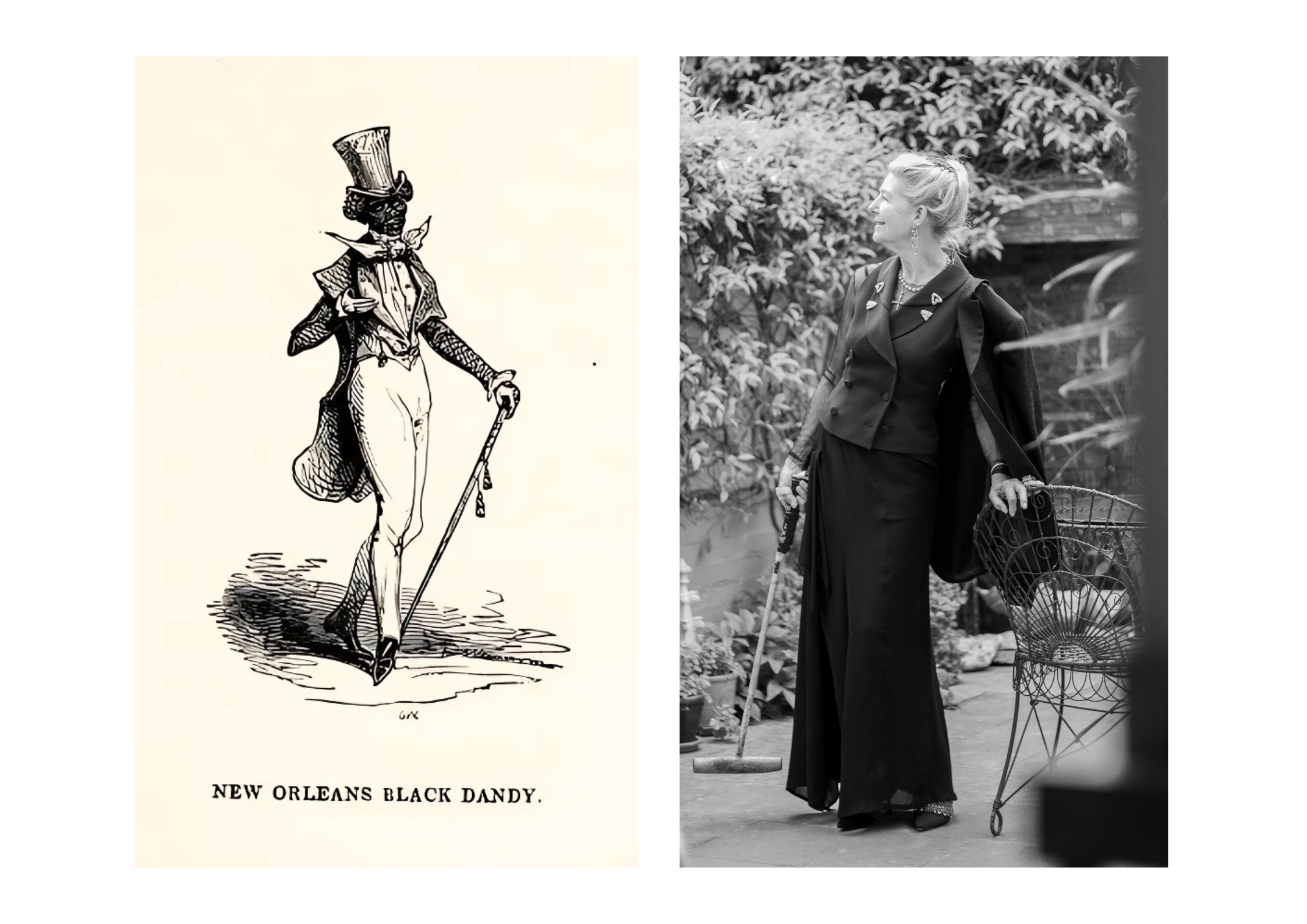 Left: A New Orleans 'black dandy' character from Mrs. Houstoun’s Yachting in the New World 1844. Public Domain. Right: Sandra Cronan's interpretation of this year’s theme.