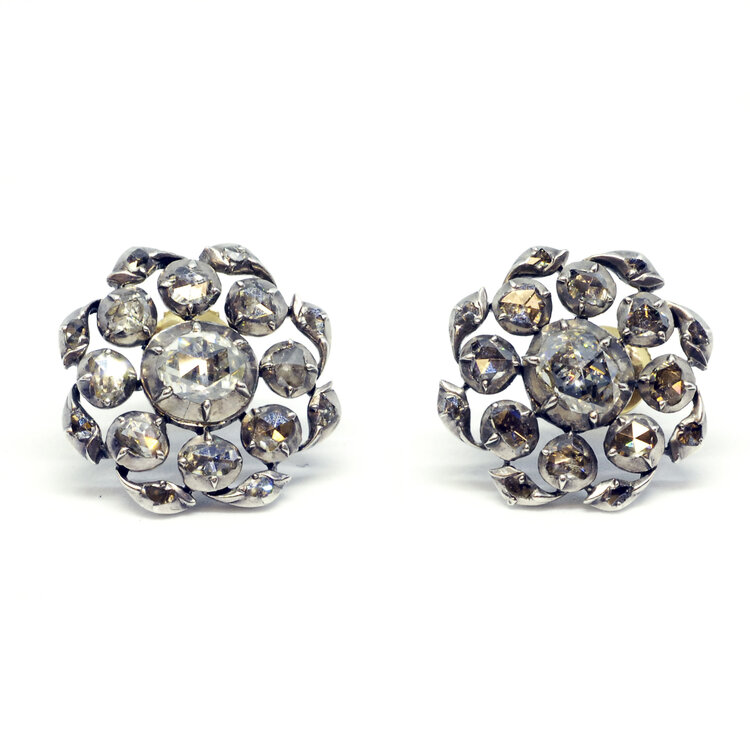 Pair of early Georgian rose cut diamond stud earrings, of foliate cluster form (originally buttons). Mounted in silver, French or possibly Russian, circa 1760.
