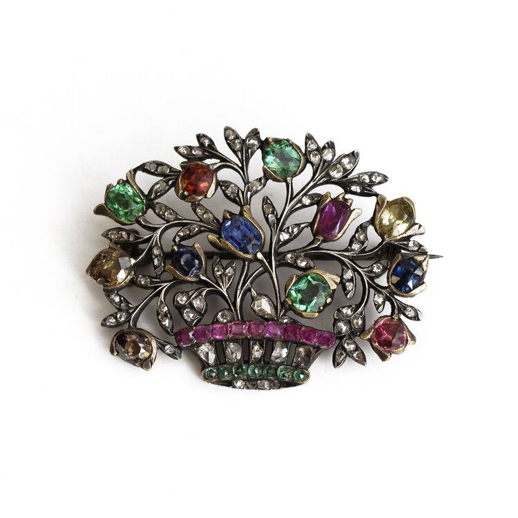 Giardinetti brooch with rose diamond-set leaves, with flower heads of 7 emeralds, 1 chrysoberyl, 3 green beryls, 2 spinels, 2 brown diamonds and 10 rubies. The basket is set with a row of rubies and emeralds, interspersed with diamonds is set in silver and gold having French marks on the clasp. Mid-18th century.