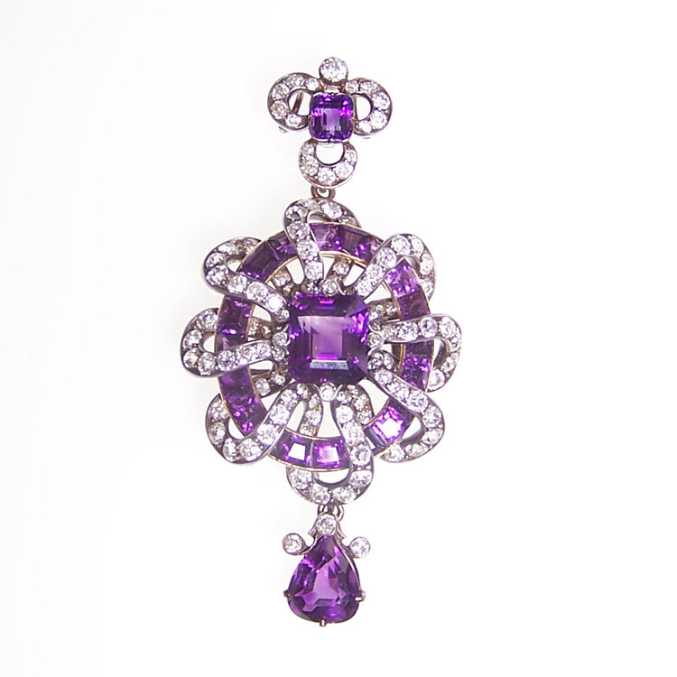 Victorian amethyst and diamond set pendant. The central emerald cut amethyst surrounded by a circle of tapered amethysts interlaced with an elaborate diamond set design. Surmounted by an amethyst and diamond trefoil and culminating with a amethyst drop pendant, mounted in 18ct yellow gold and silver. English, circa 1880.