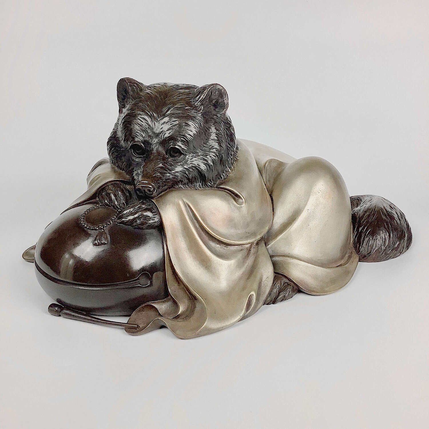 Silvered bronze Tanuki in the guise of a priest, signed Gyoko, Meiji period. W: 33.5cm H: 18.5cm D: 24cm
