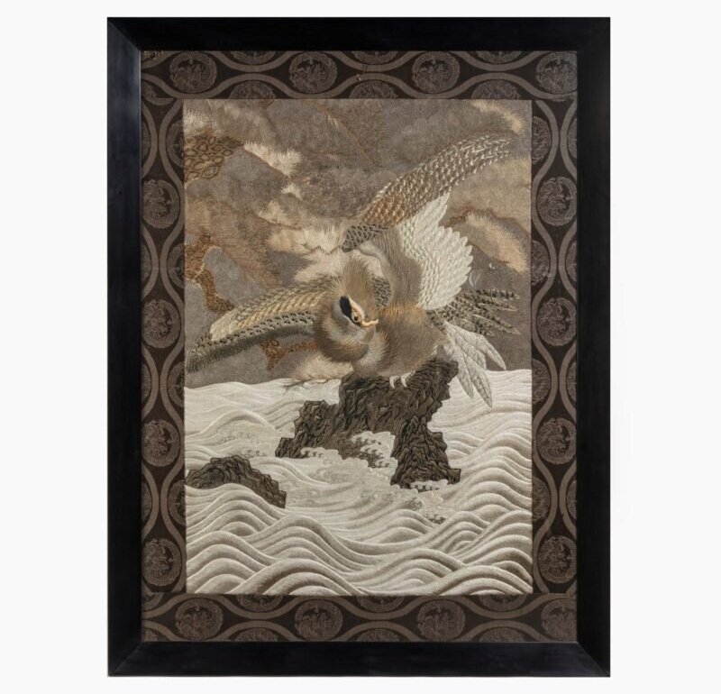 A large Meiji period silk embroidery of a sea eagle, circa 1890, H: 73.75in W: 56in.